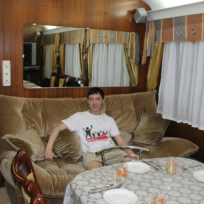 По его словам, всего в вагоне семь посадочных мест. Также Ботабеков рассказал, что вагон сдается в аренду в районе 100-130 тысяч тенге за 1000 километров для поездки в любом направлении. В нем имеется кинотеатр, душевая, свой проводник и официант. Часто вагон берут семьи для поездок на Алаколь или на EXPO в Астану. Его также называют "гостиницей на колесах".