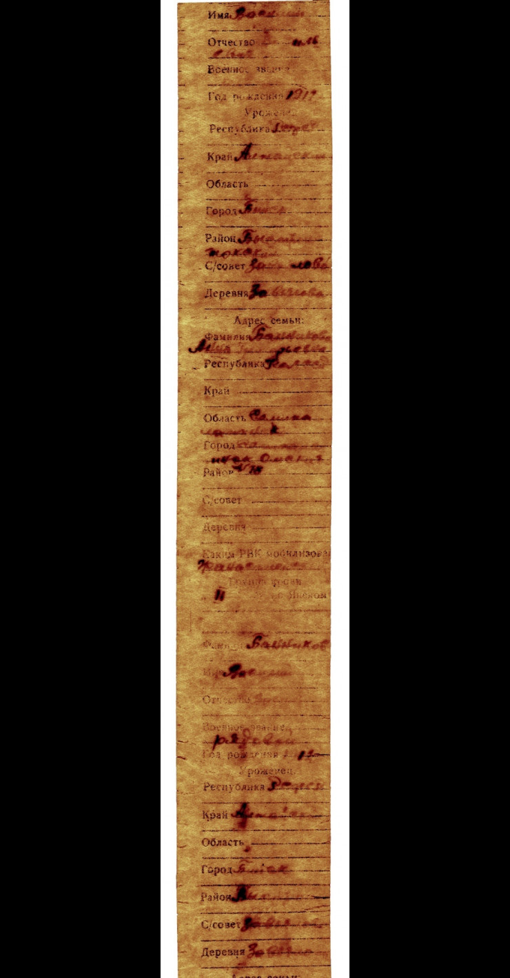 Третий погибший казахстанец – красноармеец Прокопий Иванович Читан(л)ов 1902 года рождения. В медальоне местом рождения значится Кокчетавский уезд В...ской волости, деревня Васильевка. Место призыва: Курчумский РВК. Адрес семьи: Читан(л)ова Ефросинья Эната..., Казахская республика, Восточно-Казахстанская область, Курчумский район, Пугачевский с/совет, колхоз "Ма...овод".