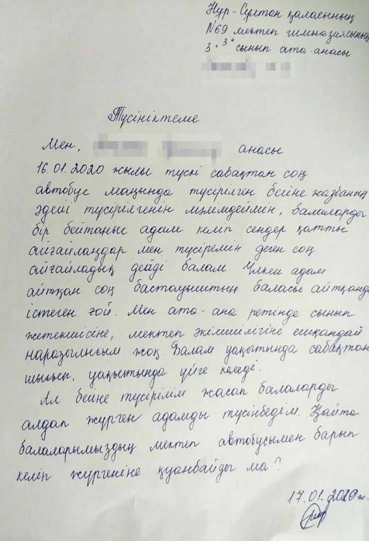 "Классный руководитель проводил учеников. На первом этаже стоит дежурный администратор, завуч. Вахтеры детей из школы не прогоняют (если нужно дождаться родителей. - Прим.). Дети вышли поиграть во двор. Они играли возле автобуса, и один мужчина попросил их стучать в двери автобуса. Не знаю, кто это", - рассказала Жулдыз Ахметова.