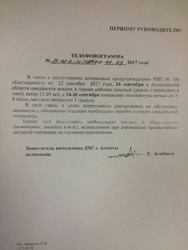 На основании штормового предупреждения ДЧС Алматы разослал телефонограмму руководителям служб гражданской защиты. "В целях оперативного реагирования на обстановку, связанную с обильными осадками, необходимо перейти в режим повышенной готовности. Кроме того, подготовить необходимую технику и оборудование, используемое при ликвидации чрезвычайных ситуаций, связанных со случаями подтопления", - говорится в телефонограмме.