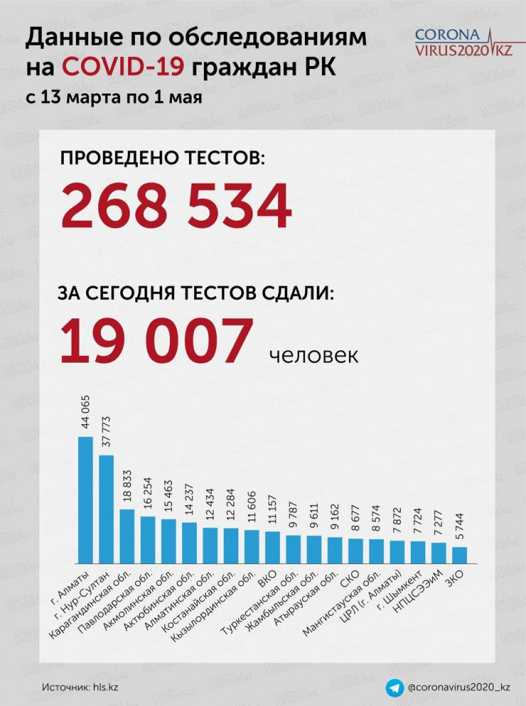 С 13 марта по 1 мая тест на коронавирусную инфекцию сдали 268 534 раза. За 1 мая тесты прошли 19 007 человек.