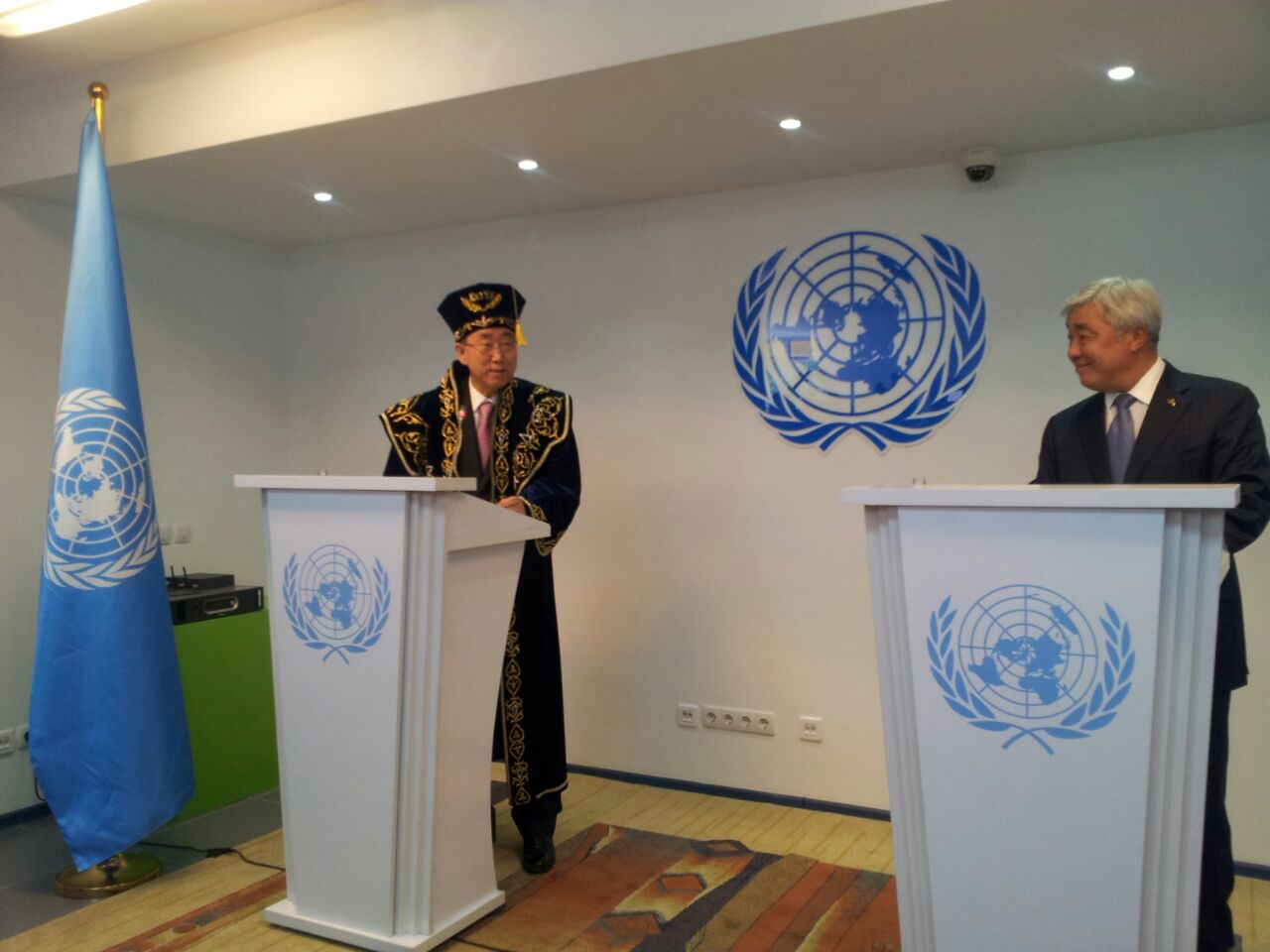 После того как генеральный секретарь ООН перерезал ленточку и поприветствовал коллег - сотрудников представительства ООН в Казахстане, ему была присвоена степень Почетного доктора Казахского национального университета имени Аль-Фараби. Церемонию награждения провел ректор вуза Галимкаир Мутанов. Он же одел Пан Ги Муна в казахский национальный костюм.