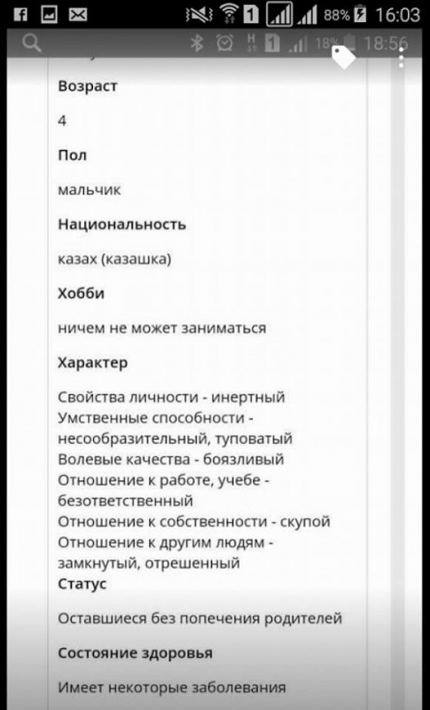 Однако, на следующий день пользователи социальных сетей возмутились содержанием анкет. Например, 4-летний мальчик был охарактеризован так: "Хобби: ничем не может заниматься. Свойства личности: инертный. Умственные способности: несообразительный, туповатый. Волевые качества: боязливый. Отношение к работе, учебе: безответственный. Отношение к собственности: скупой. Отношение к другим людям: замкнутый, отрешенный".