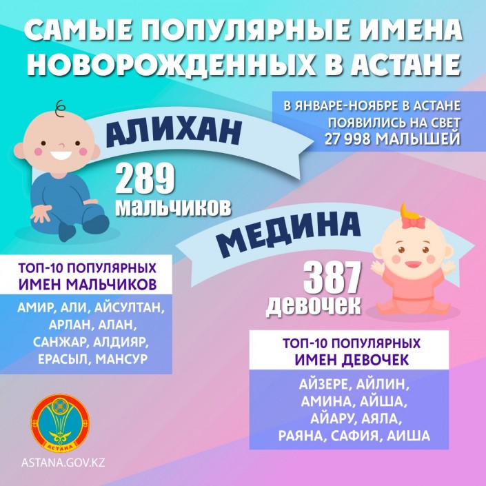 В Астане с начала 2018 года появились на свет 27 998 малышей. Согласно статистике, самыми популярными именами для новорожденных стали Алихан и Медина. Об этом сообщается на официальном сайте столичного акимата.