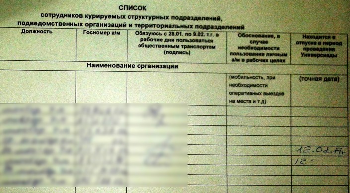 Ранее в социальных сетях появились фотографии документа, в котором указаны имена и фамилии, и есть графа "Обязуюсь с 28.01. по 9.02. текущего года в рабочие дни пользоваться общественным транспортом".