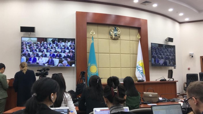 11.01 Журналисты ожидают прибытия Президента в пресс-центре Мажилиса.