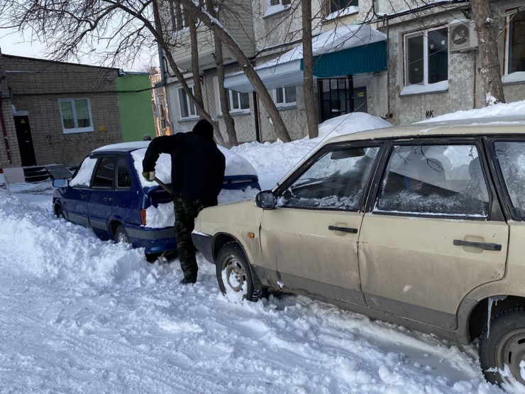 Тем временем автолюбители выкапывают свои машины после сильной метели. Некоторые занесло почти до самых окон.