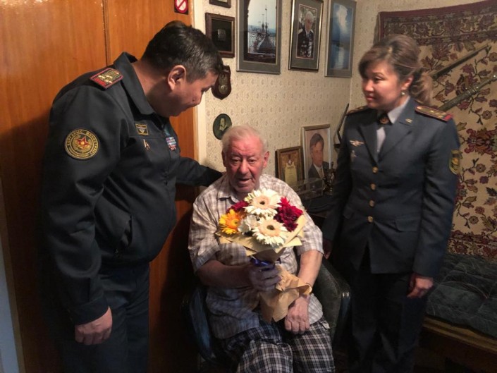 Ветерану Великой Отечественной войны Александру Казанцеву, поздравить которого также пришел личный состав военнослужащих, сейчас 102 года.