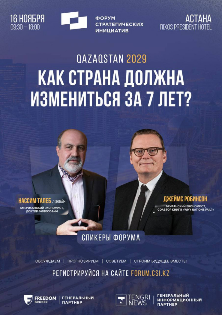 Эти и другие реформы будут обсуждаться в рамках Форума стратегических инициатив 2022, который пройдет 16 ноября в Астане. Специальными гостями форума станут соавтор книги "Почему одни страны богатые, а другие бедные?" Джеймс Робинсон и автор бестселлеров "Черный лебедь" и "Антихрупкость" Нассим Талеб (онлайн).