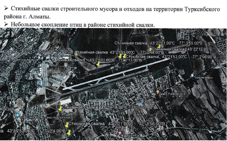 "Учитывая наиболее сложную орнитологическую обстановку в Алматинском аэропорту, Авиационной администрацией Казахстана в августе в адрес акиматов Турксибского района Алматы и Талгарского района Алматинской области выданы инспекторские предписания с требованием принять меры по ликвидации выявленных скотобоен и несанкционированных свалок на прилегающей к аэродрому Алматы территории.