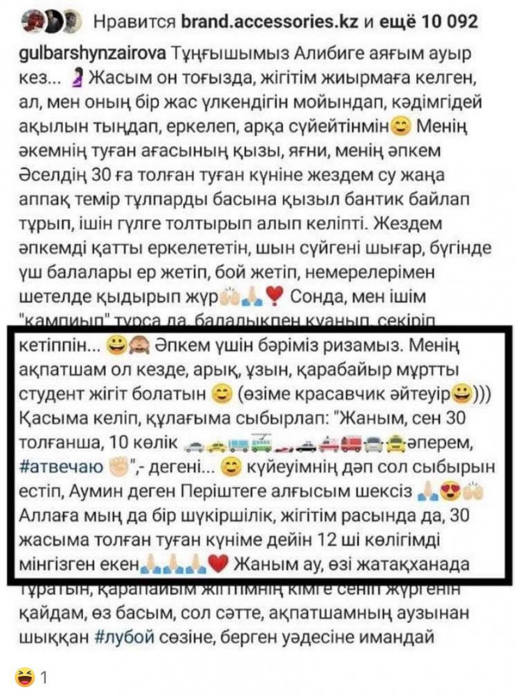 Но в сохраненных скриншотах публикации супруга главы ФСМС Гульбаршин Заирова действительно поделилась подробностями своей личной жизни. Как известно, она медийная личность - телеведущая известного республиканского канала.