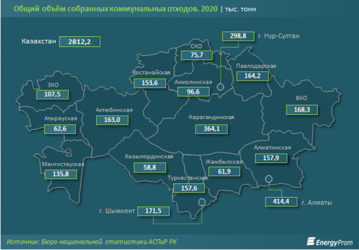 В региональном разрезе больше всего коммунальных отходов собрали в Алматы. В тройку регионов по наибольшему объему собранных отходов также попали Карагандинская область и столица. Меньше всего коммунальных отходов собрали в Кызылординской области".