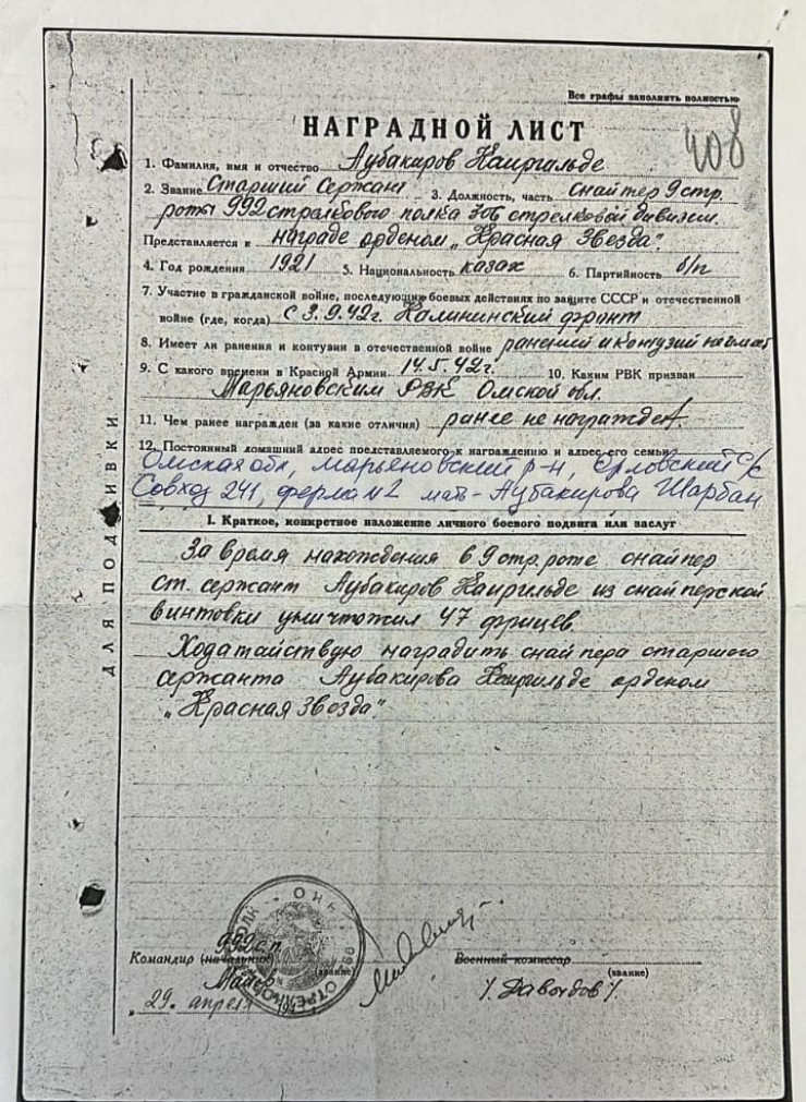 Уроженец Акмолинской области был мобилизован 5 мая 1942 года Марьяновским РВК в Омской области, воевал на Калининском фронте. Последним местом службы старшего сержанта Каиргельды Аубакирова стала 306-я стрелковая дивизия. "За время нахождения в 9-й стрелковой роте старший сержант Аубакиров Каиргельды из снайперской винтовки уничтожил 47 фрицев", - говорится в его наградном листе.