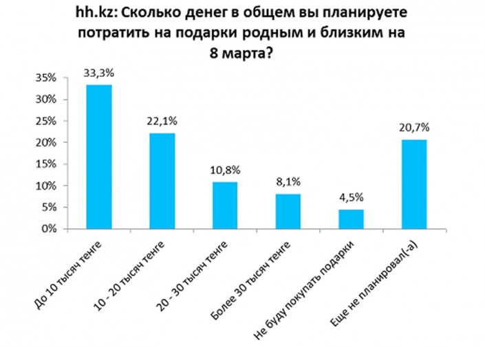 Согласно их исследованию, каждый третий казахстанец планирует потратить на подарки не более 10 тысяч тенге, а 20,7 процента опрошенных еще не планировали предстоящие расходы на подарки.