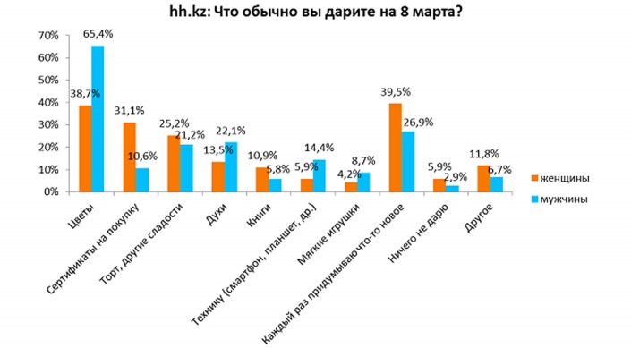 "Более 38 процентов женщин и 65 процентов мужчин чаще всего в качестве подарка на 8 Марта выбирают цветы. На втором месте по дарению среди женщин стали сертификаты на косметику, посещение салона красоты, SPA и так далее. Мужчины же предпочитают дарить духи и сладости. Согласно опросу, около 40 процентов женщин и 27 процентов мужчин каждый год придумывают новый оригинальный способ поздравить любимых женщин", - отметили в исследовании.