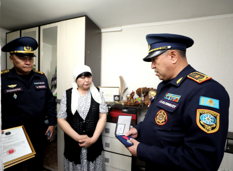 Первый вице-министр по ЧС Ибрагим Кульшимбаев 20 мая посетил семью алматинского пожарного, чтобы вручить орден. Его приняла мать спасателя Бахыткуль Курманбекова.