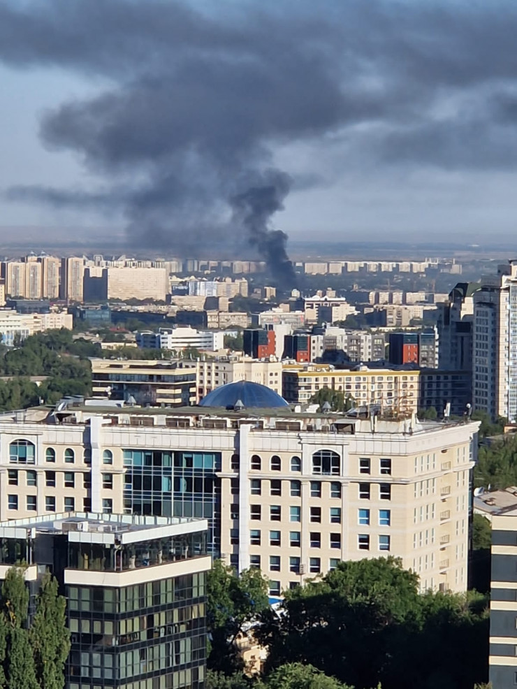 Очевидцы сообщили о черном дыме в районе пересечения проспекта Райымбека и улицы Емцова. По предварительным данным, пожар произошел на территории цеха, расположенного в этом районе.