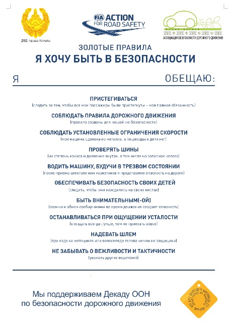 Фото с подписанным обещанием будут выкладываться в социальных сетях со следующими хештегами: #яобещаю #золотыеправила #goldenrules #ipromise #дорожнаябезопасность #roadsafetykz.