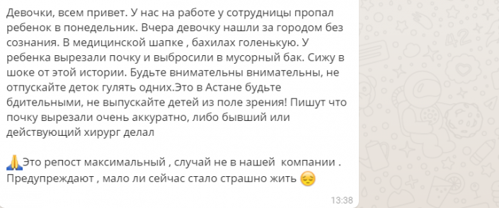Среди пользователей мессенджера WhatsApp начала распространяться информация о девочке, которая якобы была найдена в Астане в бессознательном состоянии. Также в сообщении говорится, что ребенку вырезали почку.
