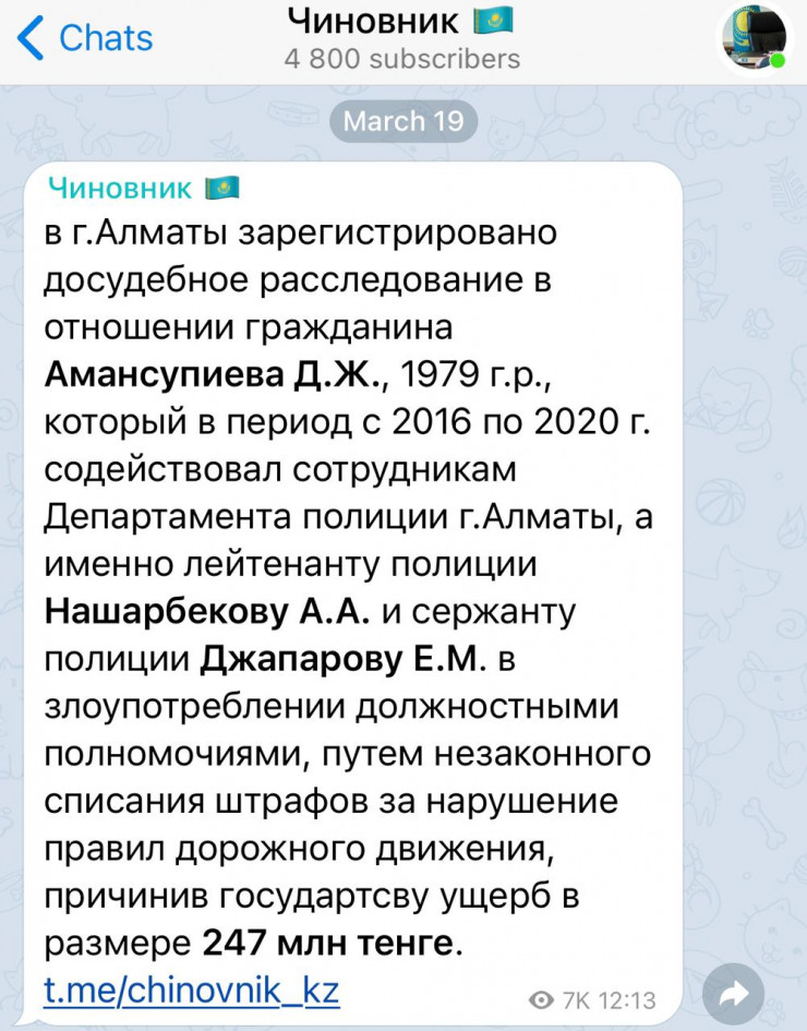 В середине марта в соцсетях появилась информация, что в Алматы зарегистрировано досудебное расследование в отношении 42-летнего жителя города по фамилии Амансупиев. Сообщалось, с 2016 по 2020 годы он содействовал сотрудникам полиции в злоупотреблении полномочиями. В деле якобы фигурируют лейтенант Нашарбеков и сержант Джапаров. Преступление заключалось в незаконном списании штрафов за нарушение ПДД. Отмечалось, что тем самым злоумышленники причинили государству ущерб на 247 миллионов тенге.