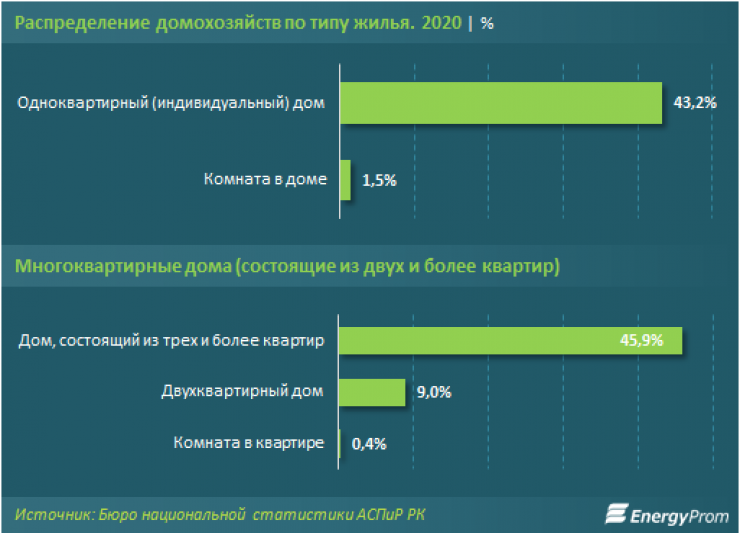 По итогам 2020 года в Казахстане насчитывалось 2,4 миллиона жилых домов. Более трети из них были расположены в Алматинской (350,9 тысячи), Туркестанской (325,5 тысячи) и Восточно-Казахстанской (210,4 тысячи) областях.