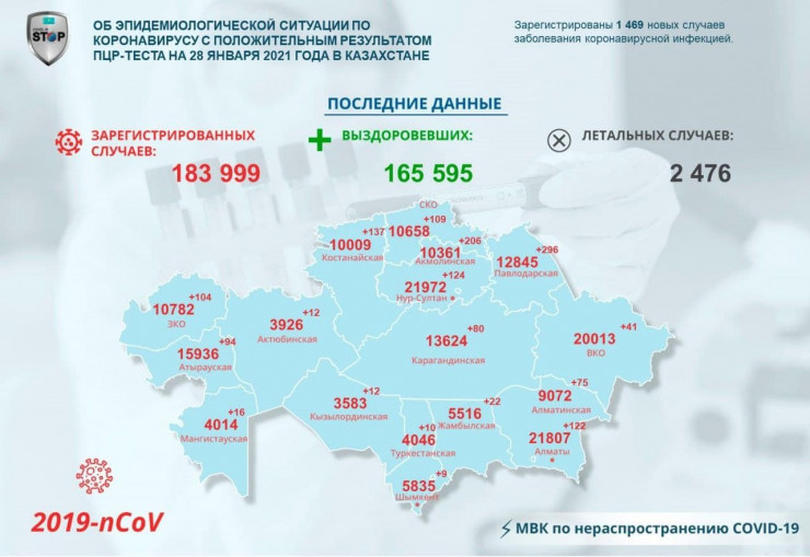 За прошедшие сутки 28 января в Казахстане зарегистрированы 1 469 новых случаев заболевания коронавирусной инфекцией, передает Tengrinews.kz со ссылкой на данные Межведомственной комиссии по нераспространению COVID-19.