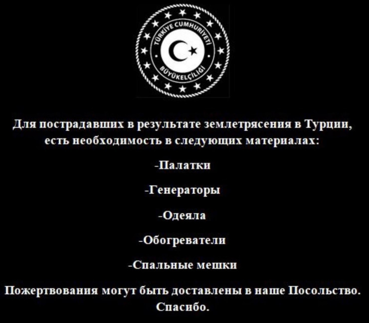 "В связи с первоочередными потребностями и логистическими возможностями, возникшими после землетрясения, будем признательны, если помощь, оказываемая нашему посольству/ генконсульству будет ограничена только материалами, список которых приведен ниже", - говорится в сообщении.