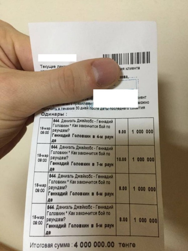 За несколько дней до поединка в соцсетях появилось фото чека, на котором были видны четыре ординарные ставки. Игрок поставил по миллиону тенге на победу Головкина нокаутом в четвертом, пятом, шестом и седьмом раундах. В букмекерской компании не подтвердили, но и не опровергли информацию о сделанных ставках на общую сумму в четыре миллиона тенге.