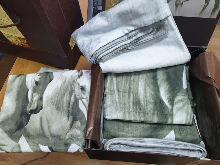 Иногда даже приносят постельное белье. Сейчас на сайте можно купить комплект из простыней и наволочек с изображением белых скакунов.