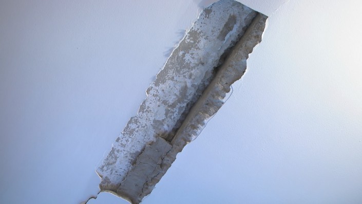 Сейчас Галина Ташкенбаева с детьми ходит по гостиной только вдоль стен, по периметру. Выходить в центр комнаты страшно, признается женщина. Центральная плита на потолке прогнулась и в середине на 5-6 сантиметров ниже остальных. Штукатурка обваливается. По плите пошли поперечные трещины.