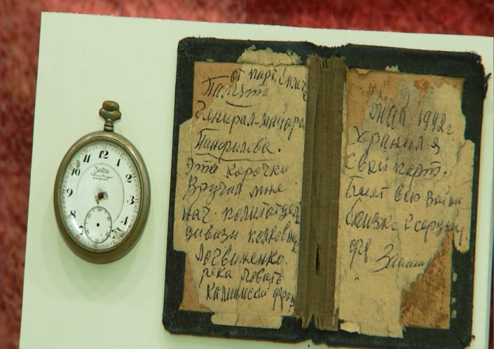 "Я привезла некоторые экспонаты, которые касаются моего деда Ивана Васильевича Панфилова. Это книга из его личной библиотеки 1936 года издания, часы. Но самая ценная, на мой взгляд, вещь - это корочка от партбилета, которую передал комиссар Логвиненко водителю моего деда, когда тот  погиб. И водитель всю войну носил как талисман ее, и хранил уже свой партбилет в этой корочке, затем передал в нашу семью. Также мы передали оригиналы двух грамот о присвоении звания Героя Советского Союза двоим из 28 панфиловцев, фотографию Бауржана Момышулы с его автографом. Кроме того, уникальными являются оригиналы знамен воинских частей из 301-й, 310-й и 312-й дивизий, а также 768 истребительно-авиационного полка, который был сформирован в Шымкенте. Это знамена, которые с 41-го года прошли всю войну", - рассказывает внучка Героя Советского Союза Ивана Панфилова Алуа Байкадамова.
