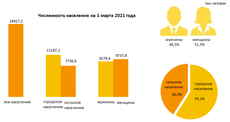 "Численность населения страны на 1 марта 2021 года составила 18 917,2 тысячи человек, в том числе городского - 11 миллионов 187,2 тысячи (59,1 процента), сельского - 7 миллионов 730 тысяч - 40,9 процента человек. По сравнению с 1 марта 2020 года численность населения увеличилась на 245,3 тысячи человек, или 1,3 процента", - сообщили в ведомстве.