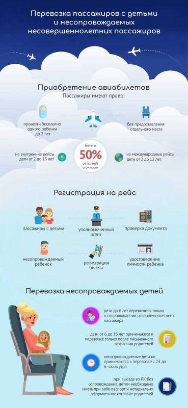 "Каждый взрослый человек имеет право на провоз одного малыша до двух лет без покупки отдельного авиабилета. Ребенок не имеет своего места и находится на руках у взрослого. Детям от двух до 15 лет на внутренних рейсах и от двух до 12 лет на международных рейсах полагаются скидки в размере 50 процентов от стоимости авиабилета. На место для детей 2-12 лет полагается провоз багажа по нормам, предусмотренным для взрослых билетов", - пояснили в КГА.