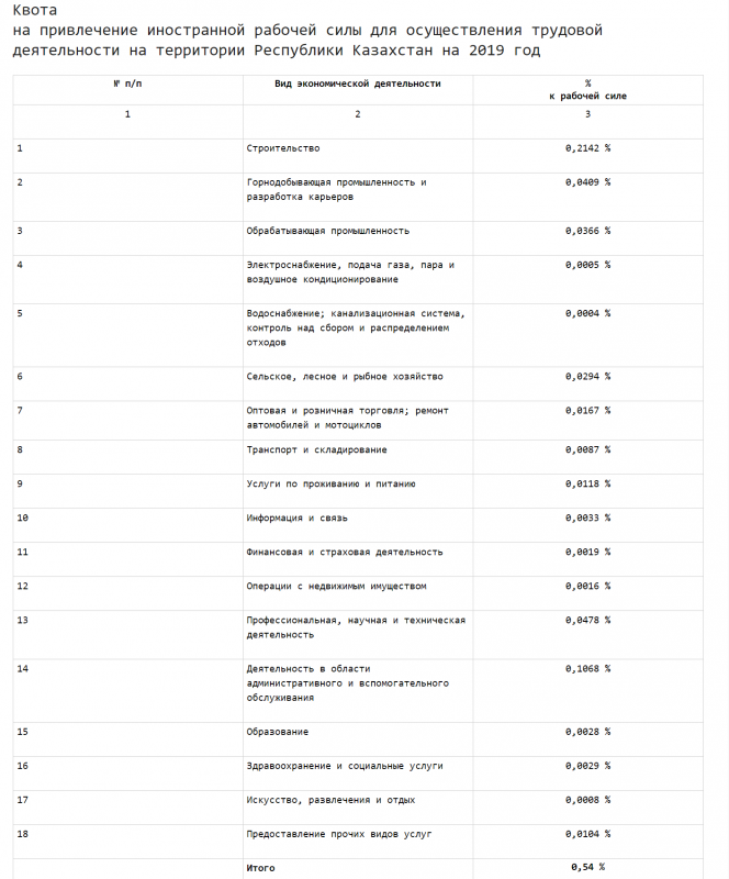 "Правительство постановляет установить квоту на привлечение иностранной рабочей силы для осуществления трудовой деятельности на территории Казахстана на 2019 год в процентном отношении к численности рабочей силы: по видам экономической деятельности согласно приложению к настоящему постановлению; на привлечение трудовых иммигрантов в размере 4,2 процента", - говорится в сообщении.