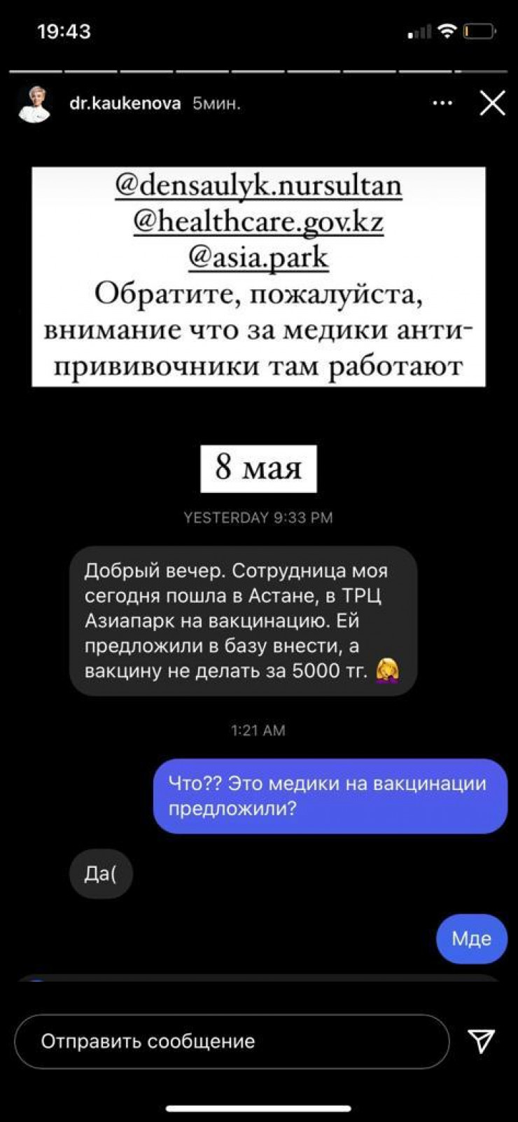 "Сотрудница моя пошла в ТРЦ Asia Park на вакцинацию. Ей предложили в базу внести, а вакцину не делать за 5 тысяч тенге", - рассказала Каукеновой ее подписчица в соцсети.