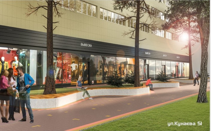 По данным экспертной группы, колористическое решение фасада здания по адресу: улица Кунаева, 51, неприемлемо, так как предлагает закраску естественного камня, которым отделано здание. В связи с этим рекомендовано сохранить существующую облицовку с восстановлением ее свойств.