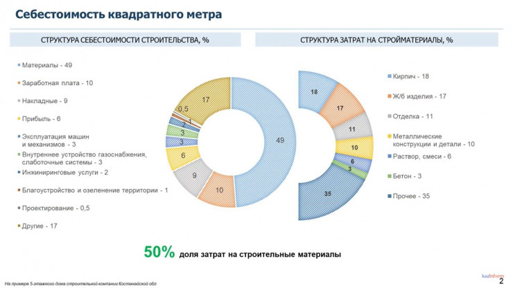 "49 процентов состоит из строительных материалов, 10 процентов - зарплаты, 9 процентов - накладные расходы, 6 процентов составляет прибыль. В структуре затрат на стройматериалы большую долю составляют кирпичи, железобетонные изделия, отделочные материалы и металлоконструкции", - сообщил глава агентства.