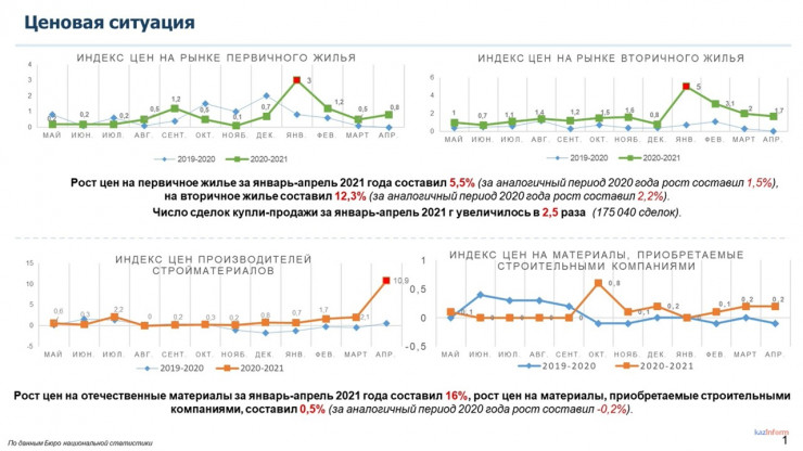 "На сегодня ситуация с ценами на рынке жилья нестабильная, отличается волатильностью. Рост цен на первичное жилье за январь-апрель 2021 года составил 5,5 процента. На вторичное жилье еще больше рост идет в этом году - 12,3 процента. Число сделок купли-продажи с начала года увеличилось в 2,5 раза - 175 тысяч сделок.