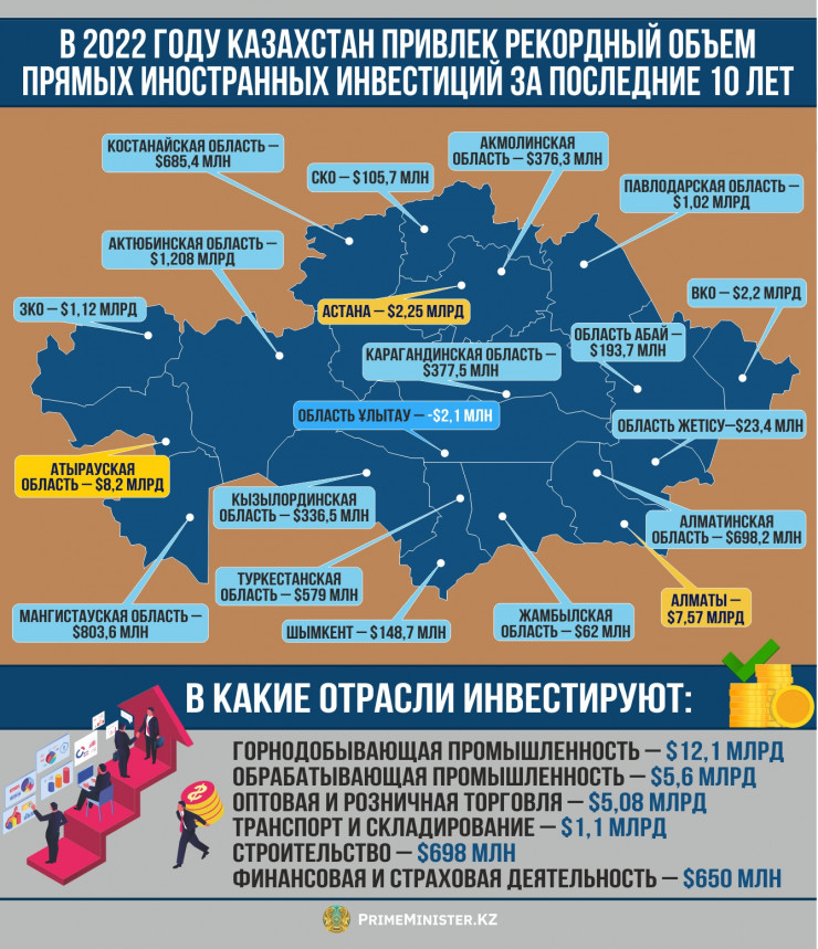 По итогам 2022 года валовый приток прямых иностранных инвестиций в Казахстан составил 28 миллиардов долларов, что на 17,7 процента больше результатов 2021 года (23,8 миллиарда долларов). Это рекордный показатель за последние 10 лет, в 2012 году объем ПИИ достигал 28,9 миллиарда долларов.
