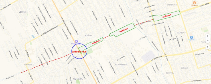 Напомним, пробивка Абая началась в 2016 году. Сначала построили дорогу в районе административного центра Наурызбайского района. Далее был проложен асфальт от улицы Яссауи до улицы Ашимова. Теперь два участка одного проспекта соединят с помощью эстакадного моста.