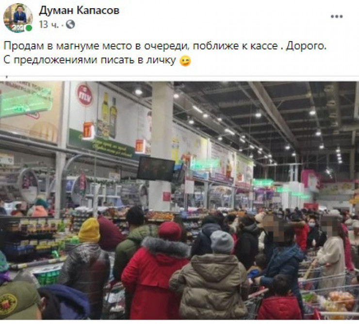 "Продам место в очереди, поближе к кассе. Дорого. С предложениями писать в личку", - пишет алматинец Думан Капасов.