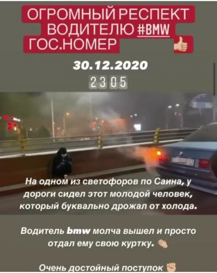"На одном из светофоров по улице Саина у дороги сидел этот молодой человек, который буквально дрожал от холода.  Водитель BMW молча вышел и просто отдал ему свою куртку. Очень достойный поступок", - написали очевидцы.