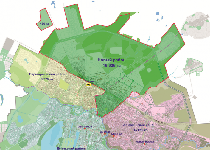 Район "Есиль": северная граница района проходит по реке Есиль; юго-восточная, южная и юго-западные составляющие прохождения границы района совпадают с существующей границей города Астаны, в границы района входят озеро Майбалык (7300 гектаров) и Национальный пантеон (959 гектаров);