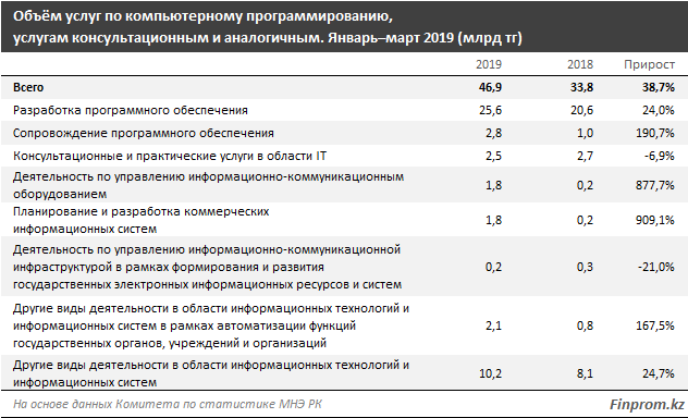 Более половины в сфере услуг в секторе приходится на разработку программного обеспечения: 25,6 миллиарда тенге, рост за год - на 24 процента.