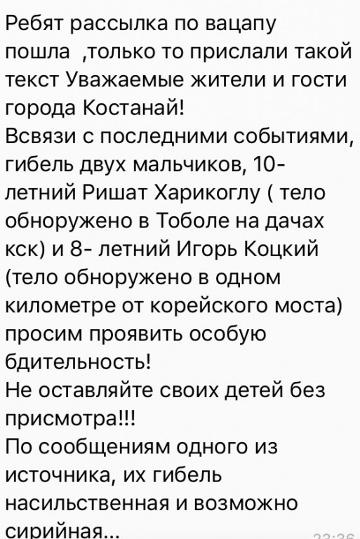"Сообщения о якобы насильственной гибели несовершеннолетних Ришата Харикоглы и Игоря Коцкого, распространяемые через WhatsApp, являются ложными. Установлены и допрошены очевидцы и другие свидетели, назначены экспертизы. В ходе расследования признаков насильственной смерти несовершеннолетних не установлено, связи между указанными фактами не имеется. Ход расследования находится на контроле прокуратуры", - сообщили порталу в пресс-службе Костанайской областной прокуратуры.