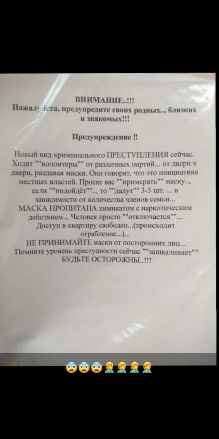 "Через социальные сети распространялась недостоверная информация, что якобы под видом социальных работников преступники раздают маски, пропитанные наркотическим веществом, после чего беспрепятственно совершают грабежи и кражи из квартир.
