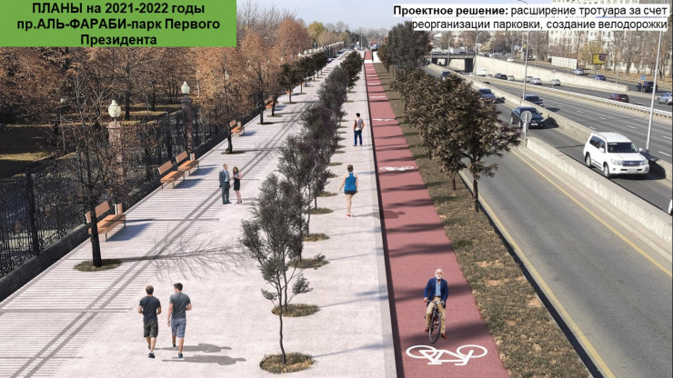 По самому проспекту Аль-Фараби от ВОАД до парка Первого Президента построят тротуары, велодорожки и автобусную полосу. Акимат планирует обновить также и весь путь до аэропорта. Подробнее читайте здесь.
