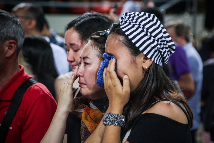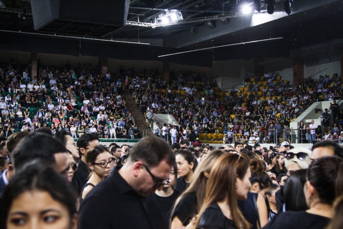 Народ рассаживается на трибуны - заняты все места, кроме южной стороны, перед которой проходит церемония прощания. Всего в зале около 3 000 мест, пространство зала тоже все заполнено. Некоторые, попрощавшись, выходят наружу через другие двери.