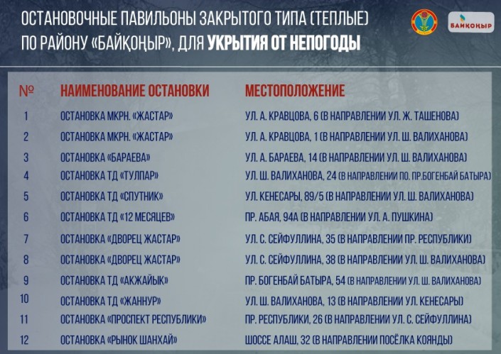 В период неблагоприятных погодных условий жителям Астаны порекомендовали воспользоваться следующими местами обогрева на территории района Байқоңыр: торговые рынки "Астаналық", "Алем", "Центральный", "Амир", "Шарын", "Кок базар", "Алай", гипермаркет "Магнум"(улица Ш. Валиханова), дворец "Жастар" (проспект Республики), ТД "Есиль" (проспект Республики), кафе "Узбечка" (улица Ташенова), бизнес-центр "Пига" по улице Ташенова, хостел на улице Пушкина, торговый дом "Шығыс" (улица Пушкина), King Otel (улица Валиханова), гостиница "Шаңырақ" (проспект Абая), ресторан "Жібек жолы", бизнес-центр "Қайнар", ТЦ "Астықжан", ТД "Жаннур", а также все АЗС, функционирующие на территории района. Акимат также определил места для обогрева для дорожных рабочих.