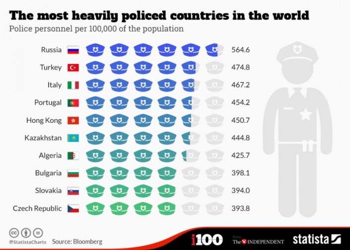 Ал бірінші орында көрші Ресей елі екен. Бұл елде 100 мың адамға 565 полицейден келеді. Екінші орында Түркия, ал үшінші - Италия.